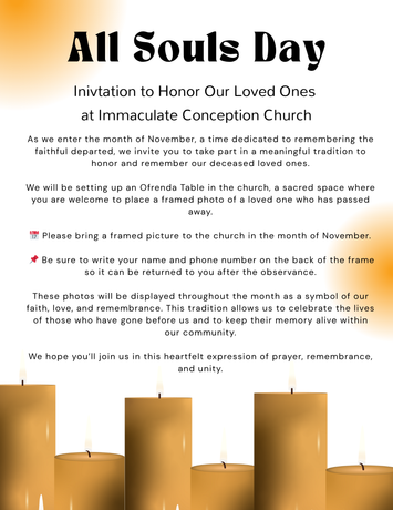 Immaculate Conception Church is a dynamic, welcoming, and multicultural Catholic community of believers, united in honoring and serving the Lord through our gifts, talents, and abilities. Strengthened by our baptismal call and nourished by the Eucharist, we are committed to sharing the Good News of Christ with all.